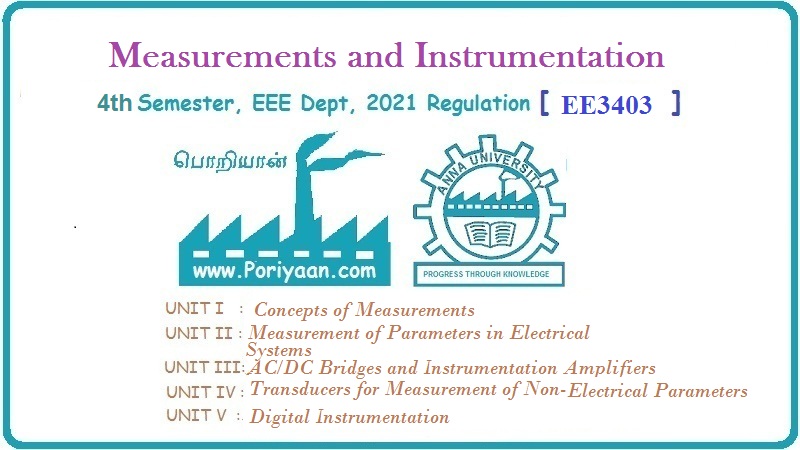 2021 regulation - 2nd year, 4th semester paper for EEE Department (Electrical and Electronics Engineering Department). Subject Code: EE3403, Subject Name: Measurements and Instrumentation, Batch: 2021, 2022, 2023, 2024. Institute: Anna University Affiliated Engineering College, TamilNadu. This page has Measurements and Instrumentation study material, notes, semester question paper pdf download, important questions, lecture notes.